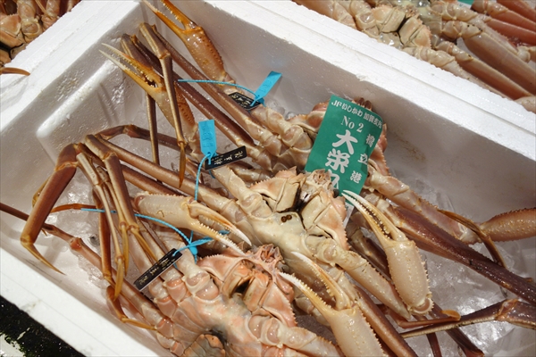 「加能ガニ」の目印は青いタグ。北陸の漁場のなかで最も美味しいズワイガニが捕れるのは、橋立港がある日本海沖数十メートルの漁場なのだそうです。ここで捕れたカニは金沢港などでも水揚げされるのがですが、橋立港のほうがより漁場に近いため、漁からセリに出るまでの時間が短く、鮮度のいいカニが並ぶのだとか。