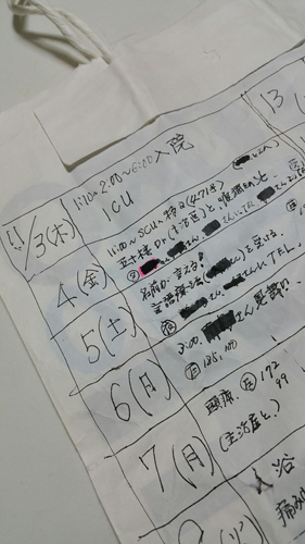 その言葉通り、頭痛と悪寒は少しずつ収まり、10日目には、ピタリと平熱になりました。血圧も、入院から1週間 180 を超える日が続いていましたが、この頃から 120 前後に落ち着きました。当初、血圧181、100……血圧って?? どんな数字だったら〇?? の状態だったのが、この頃になると、夫が枕元にぶら下げておいてくれた紙袋の記録のおかげで、体温や血圧の意味することを少しずつ認識できるようになっていました。